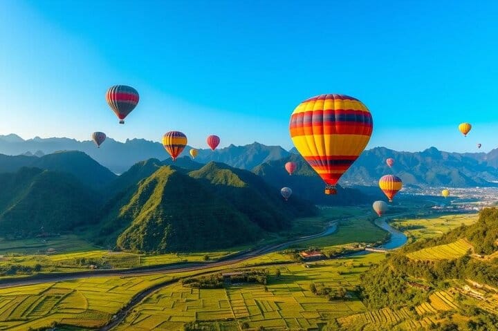Gently rise into the sky on a hot air balloon ride over the breathtaking landscapes of Vang Rong, Laos. As the morning light or golden sunset bathes the karst mountains, clouds drift beneath your feet and the Nam Song River winds through emerald rice fields like a ribbon of jade. With a burst of flame, the balloon lifts higher, revealing dramatic limestone cliffs, hidden caves, and quiet villages below. During the 30-minute flight, enjoy unobstructed 360-degree panoramic views—perfect for capturing stunning photos of pagodas glowing in the light and the ever-changing colors of the sky. Flying at the most magical times of day (around 5:30 AM or 4:30 PM), this unforgettable experience promises one of the most romantic cloud-top memories of your Southeast Asia journey.